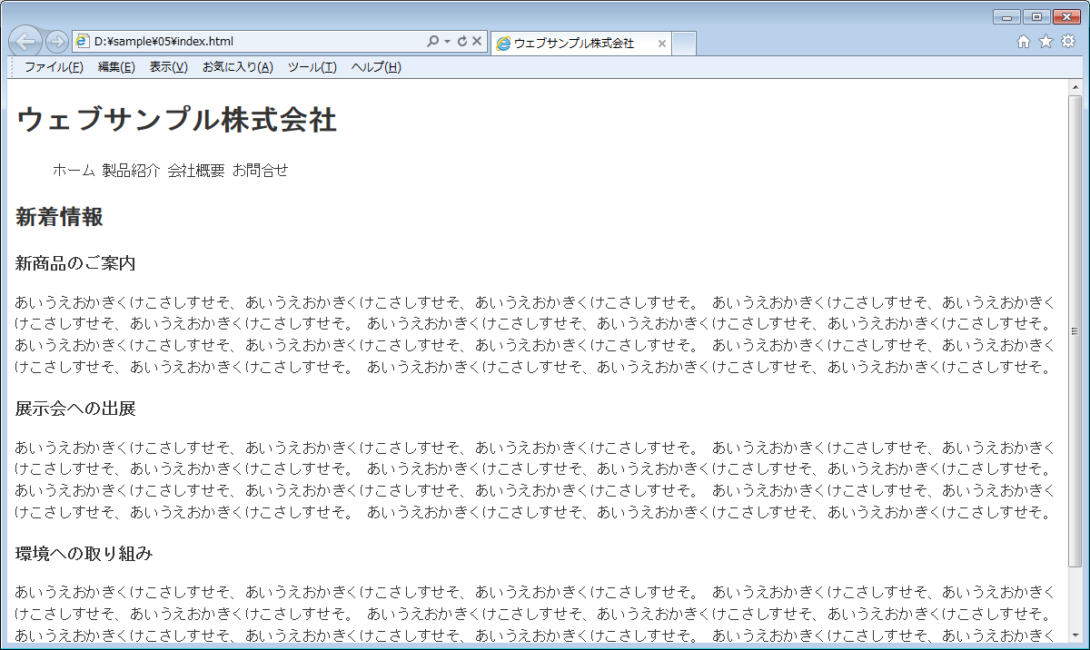 ここまでの制作段階で、サンプルサイトは以下の状態となっています。